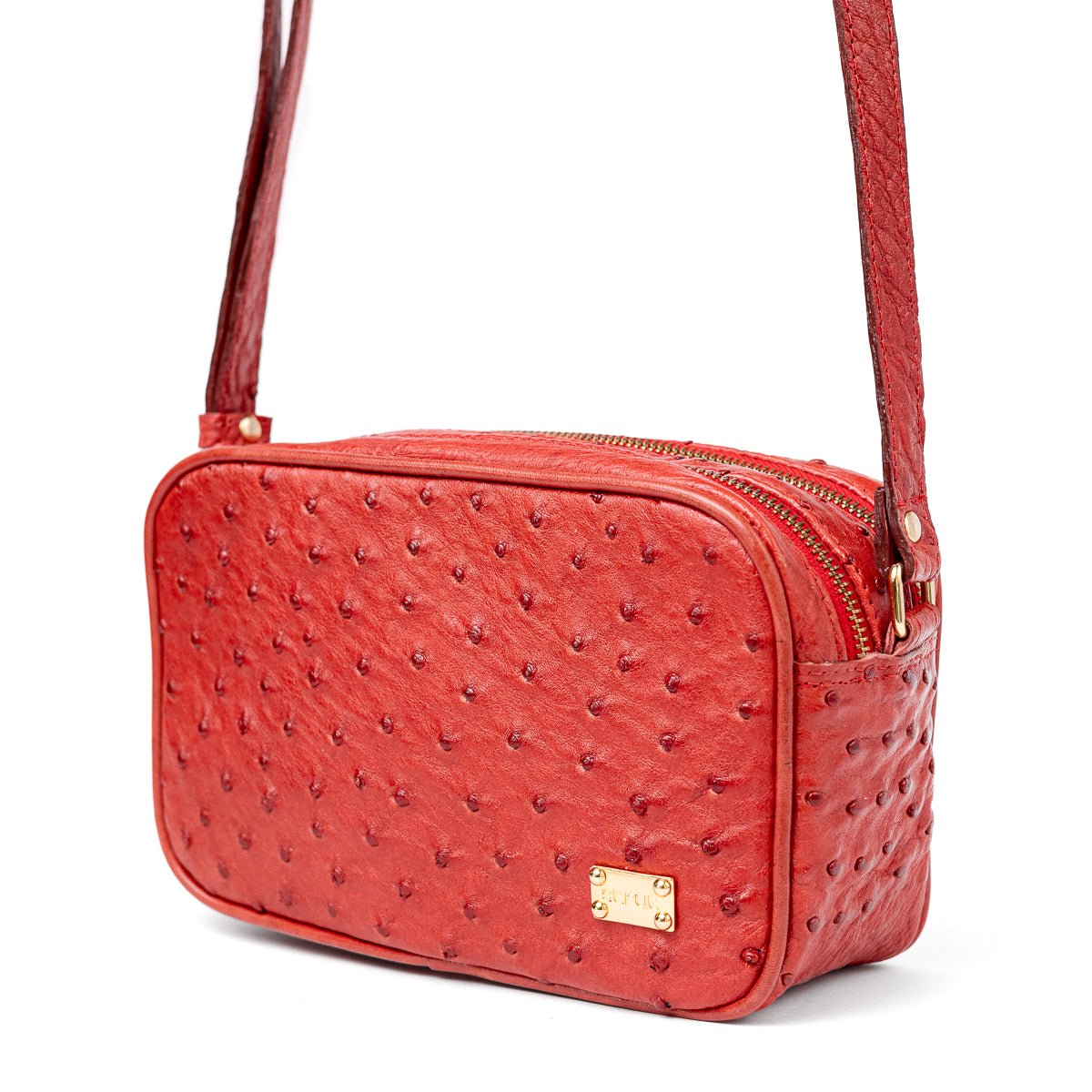 Bolsa Transversal em Couro de Avestruz Feminina 2 Zíperes Vermelha