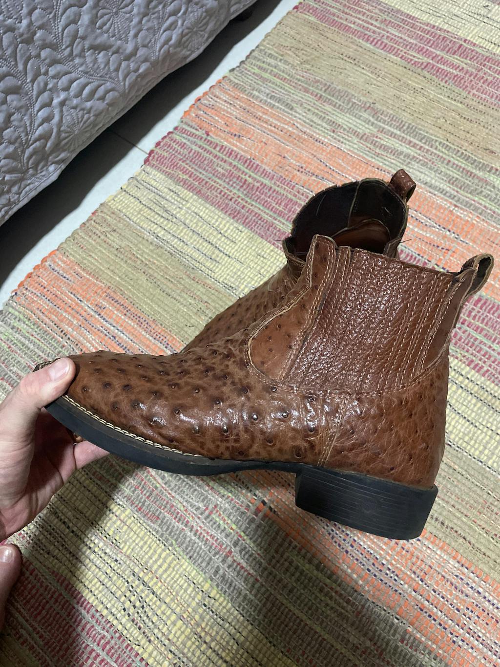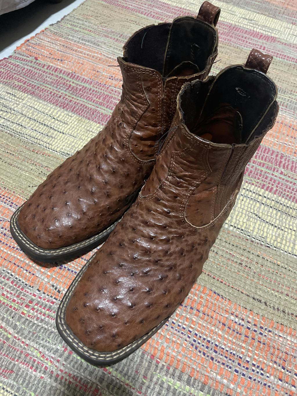 A Botina Masculina Strut em Couro de Avestruz Cheio Caramelo com bico quadrado combina a resistência do couro de avestruz com um design moderno e sofisticado. O formato do bico proporciona conforto e estilo contemporâneo, ideal para homens que valorizam exclusividade e durabilidade. Seu acabamento impecável e ajuste preciso garantem segurança e elegância em todas as ocasiões. Um calçado versátil que une tradição e inovação para complementar qualquer visual.