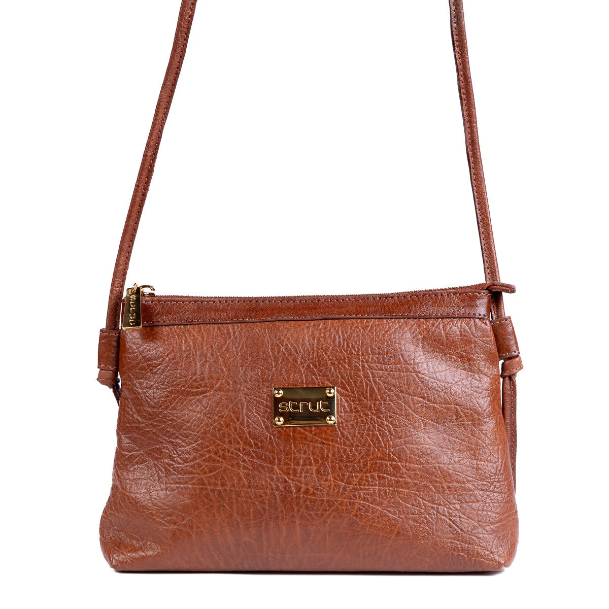 Com design compacto e leve, esta bolsa é perfeita para o dia a dia, oferecendo espaço suficiente para seus itens essenciais. O acabamento em metais dourados, com destaque para o logo Strut na parte frontal, adiciona um toque de luxo e exclusividade.