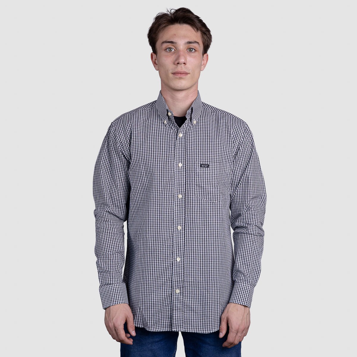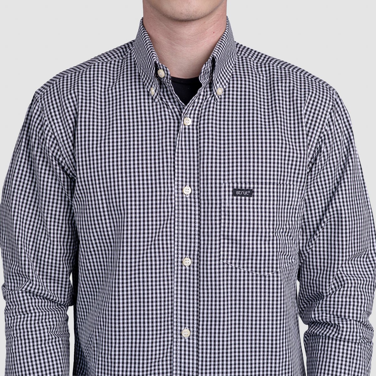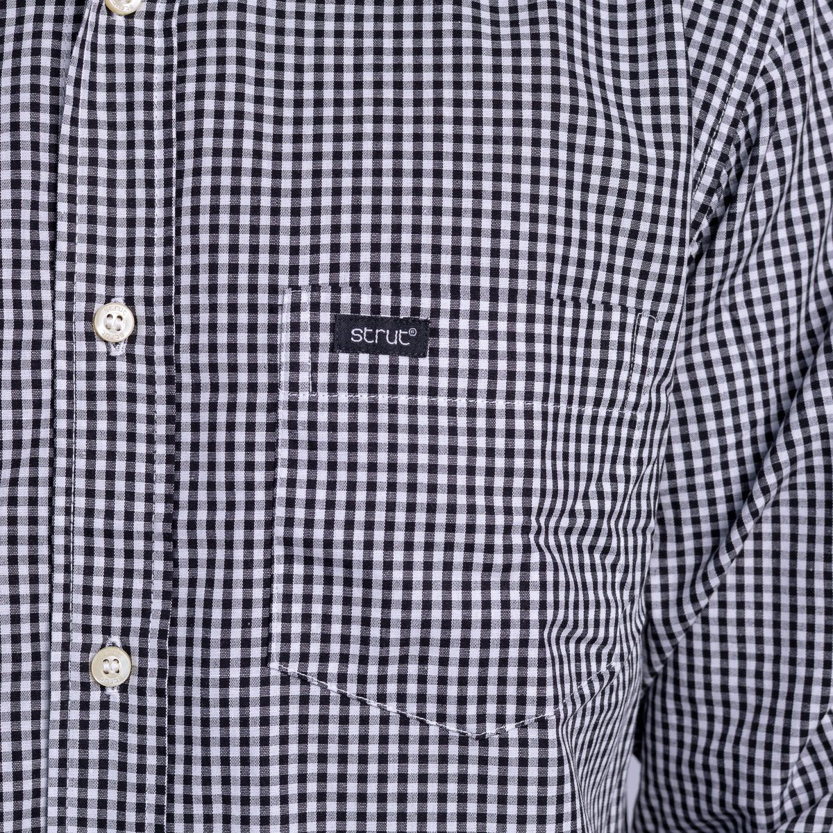 Camisa xadrez masculina Strut em algodão de qualidade, com padrão clássico preto e branco em xadrez pequeno. Manga longa versátil que combina com calças jeans, chinos ou sociais, perfeita para looks casuais ou mais refinados. Corte confortável que acompanha seus movimentos o dia todo, com acabamento impecável em cada detalhe. Essencial no guarda-roupa de quem valoriza estilo atemporal e praticidade. Invista em uma peça que nunca sai de moda.