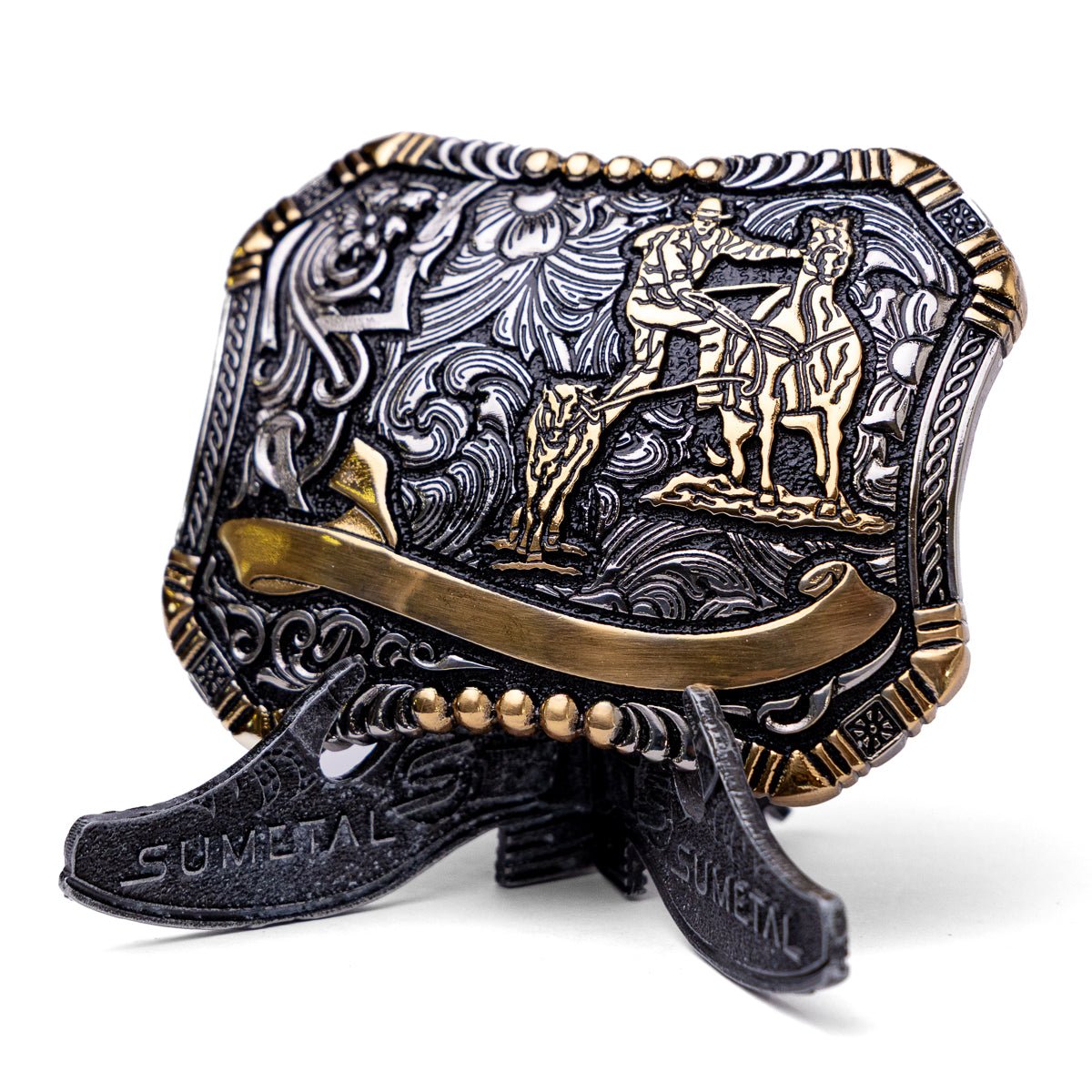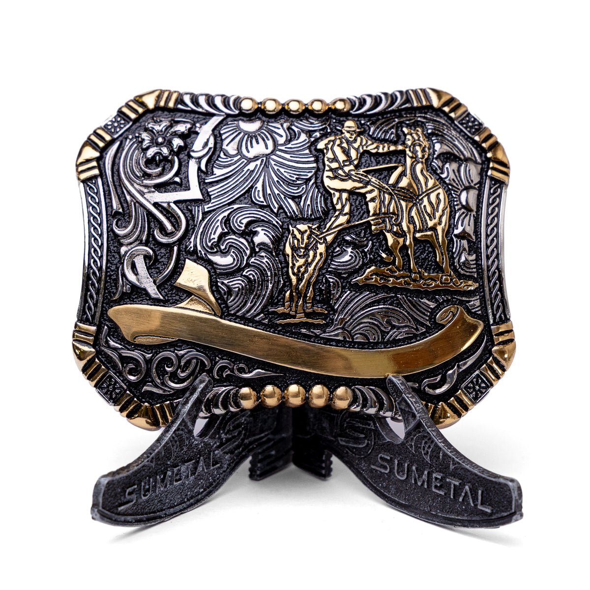 A Fivela Country Laço Bezerro Masculina é um acessório que une tradição e modernidade. Banhada em níquel e ouro, esta fivela com formato retangular em relevo e um desenho sofisticado é uma peça essencial para qualquer guarda-roupa country. Ideal para ser utilizada em provas, Festas de Rodeio e Festa do Peão, a fivela se destaca quando combinada com um cinto de couro, trazendo um toque de beleza e sofisticação ao visual.